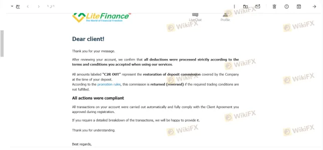 LiteFinance ने मेरी पिछली शिकायत पर आधिकारिक तौर पर जवाब दिया है, यह स्वीकार करते हुए कि उन्होंने "कमीशन की बहाली" (C2R OUT) के बहाने $193 जब्त कर लिए। वे ग्राहकों के खातों से पूंजी चुराने को सही ठहराने के लिए छिपे हुए, अनुचित नियमों का उपयोग कर रहे हैं। मैं उनके शिकारी व्यवहार के प्रमाण के रूप में उनका ईमेल जवाब संलग्न कर रहा हूं।